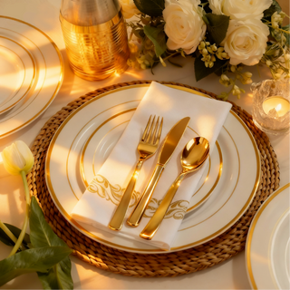 Transform your special occasions with our elegant plastic dinnerware sets. Featuring gold and silver rimmed designs, these sets are perfect for weddings and upscale parties. Made from high-quality materials, they offer the look of real china without the worry of breakage.