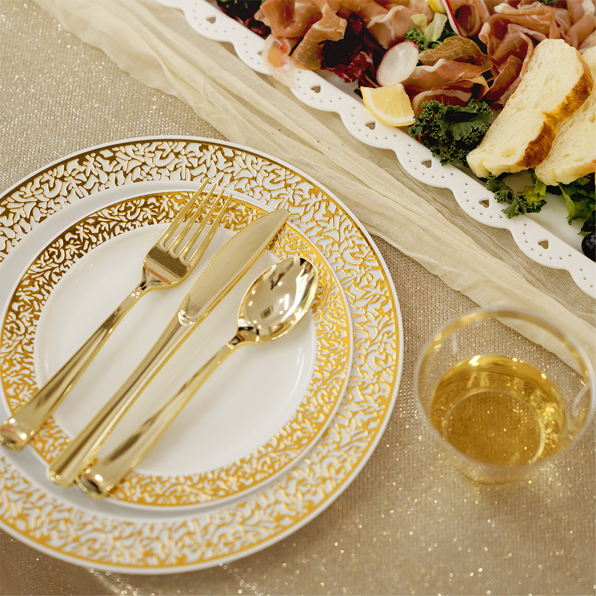 Elevate your dining experience with a luxurious tactile feel and timeless, elegant design. Crafted from high-quality, BPA-free recyclable materials, this disposable dinnerware set brings style and convenience to weddings, birthdays, holiday gatherings, and more. The refined bas-relief pattern adds an artistic touch, while sturdy construction ensures each piece holds a full plate of food securely—no bending, no fuss.